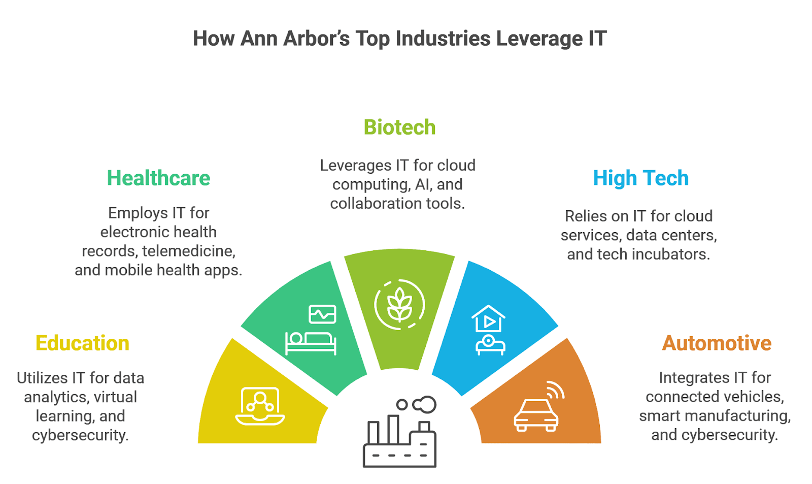 From enhancing education and patient care to driving innovation in biotech and high tech, IT plays a pivotal role in Ann Arbor’s top industries. Each sector’s reliance on IT highlights the need for robust and reliable IT solutions.