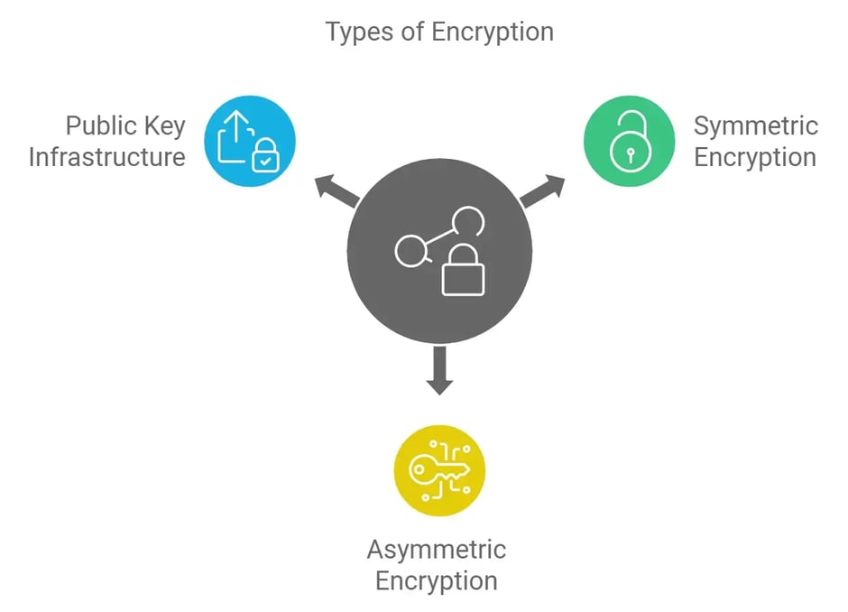 - Symmetric Encryption uses the same key for encryption and decryption. This method is fast and commonly used for securing large amounts of data.